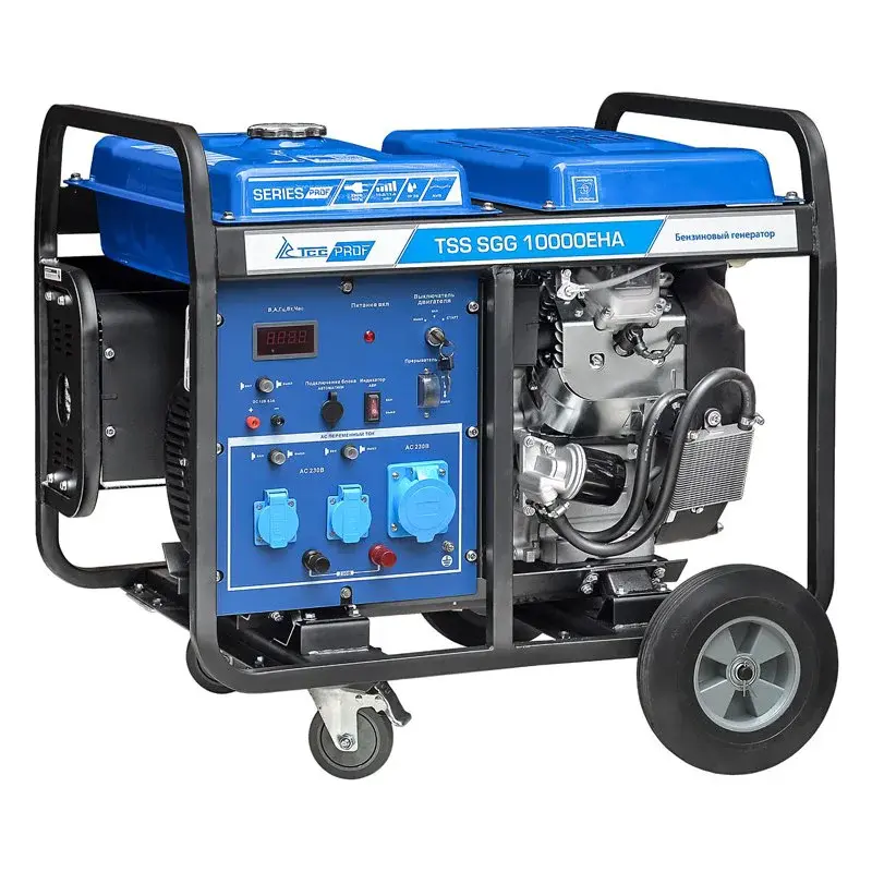 Бензогенератор TSS SGG 10000EHA на четырех колесах способен питать однофазное оборудование мощностью до 10 кВт. Модель отлично подходит для использования как в качестве запасного источника питания, так и основного.