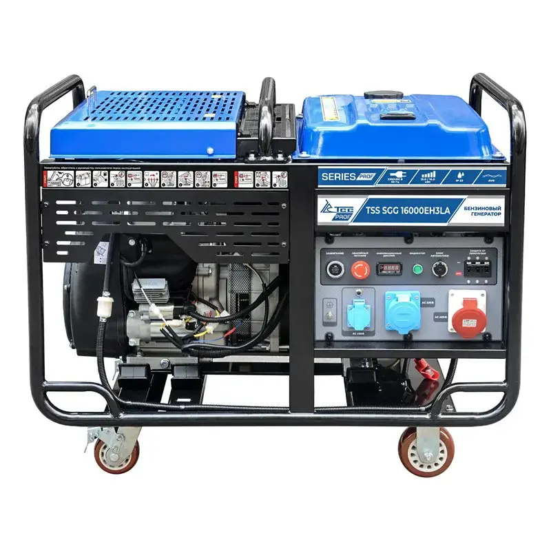 Бензиновый генератор TSS SGG 16000EH весит 240 кг. Для удобного перемещения такой тяжелой модели по рабочей площадке есть транспортировочный комплект. Он состоит из 4 колес, прикрепленных к раме.