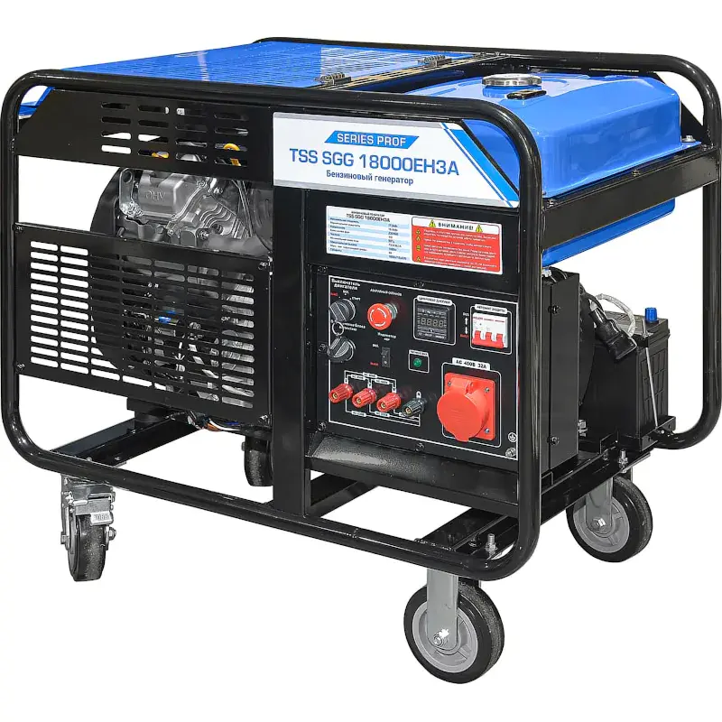 Генератор ТСС SGG 18000EH3A оборудован колесами для удобства перемещения. Прочная стальная рама защищает двигатель от механических внешних воздействий. Электрическая розетка снабжена крышкой, предохраняющей от влаги и пыли. Специально предусмотренные выходы на лицевой панели позволяют подключить блок ввода резерва для автоматического включения генератора при отсутствии напряжения в сети.