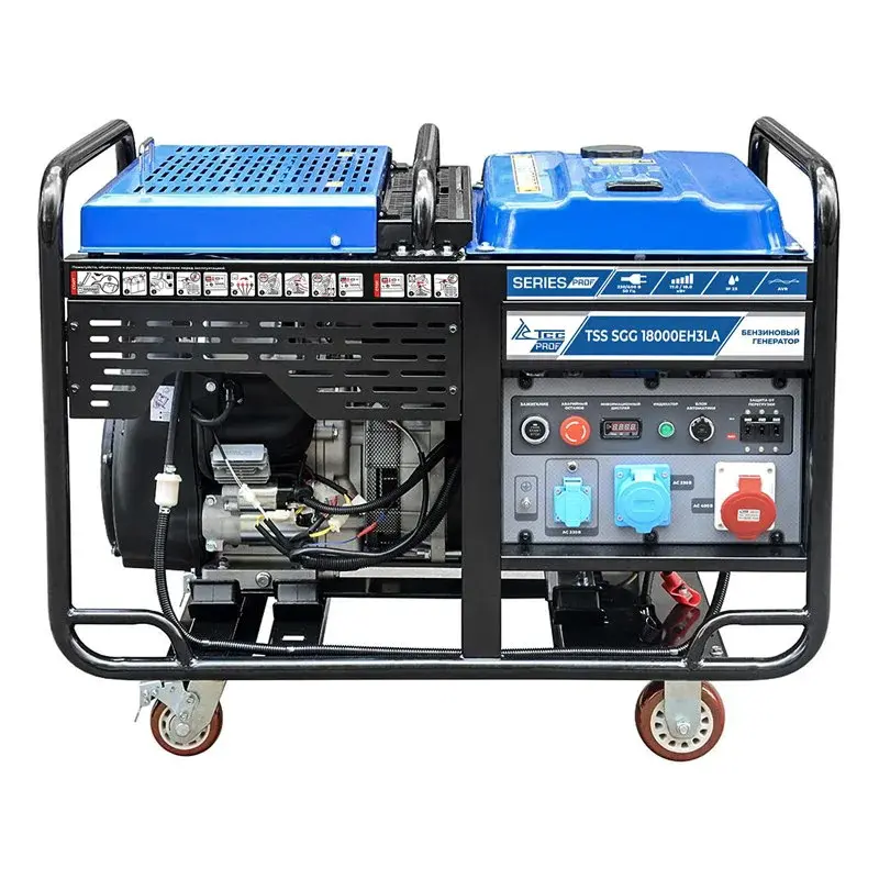 Бензогенератор TSS SGG 18000EH3LA используется для питания одного или нескольких трехфазных потребителей общей мощностью до 17 кВт. Для простого перемещения по рабочей площадке модель оснащена 4 колесиками и 3 рукоятками в верхней части корпуса.