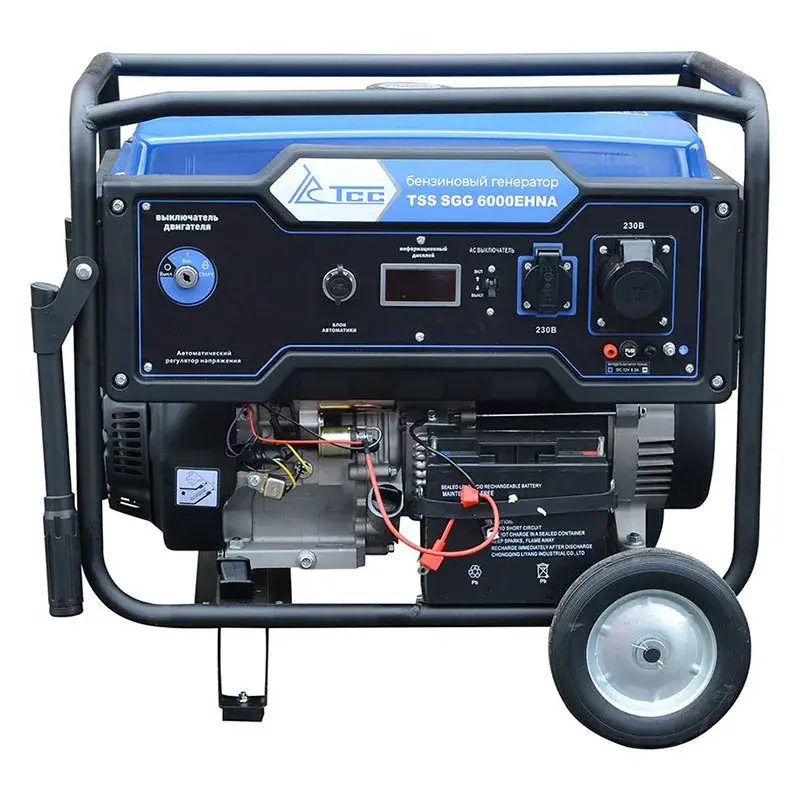Бензогенератор TSS SGG 6000EHNA легко перемещать по площадке благодаря транспортировочному комплекту, который включает в себя 2 колеса и складную ручку. Модель позволит вам запитать однофазные потребители, суммарная мощность которых не превышает 6 кВт.