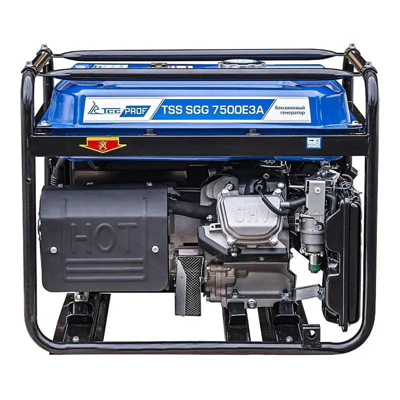 За счет открытого типа конструкции бензинового генератора TSS SGG 7500Е3A все основные важные узлы находятся в быстром доступе для ремонта или обслуживания. Для защиты от случайных механических повреждений используется рама из стальной трубы, огибающей корпус. Для удобного отслеживания рабочих параметров в трехфазном бензиновом генераторе предусмотрен многофункциональный дисплей. На экране можно просмотреть текущие параметры частоты тока, напряжения, а также отработанные часы.