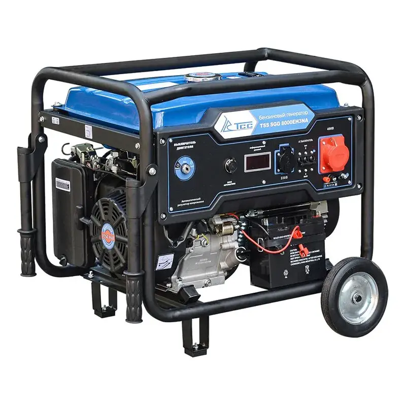 Бензогенератор TSS SGG 8000EH3NA обладает номинальной мощностью 7,8 кВт и способен питать как однофазные, так и трехфазные потребители. Для удобного перемещения модели по рабочей площадке есть два транспортировочных колеса, а также складная ручка.