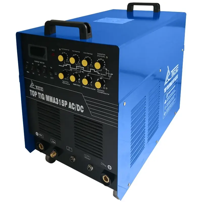 Аппарат аргонодуговой сварки алюминия ТСС TOP TIG/MMA-315P AC/DC - сварочный аппарат инверторного типа, для аргонодуговой сварки неплавящимся электродом в среде защитного газа (TIG) на постоянном (сварка сталей, меди, титанаи пр.) и переменном токе (сплавы алюминия, магния, медные сплавы больших толщин) и для ручной дуговой сварки (ММА).