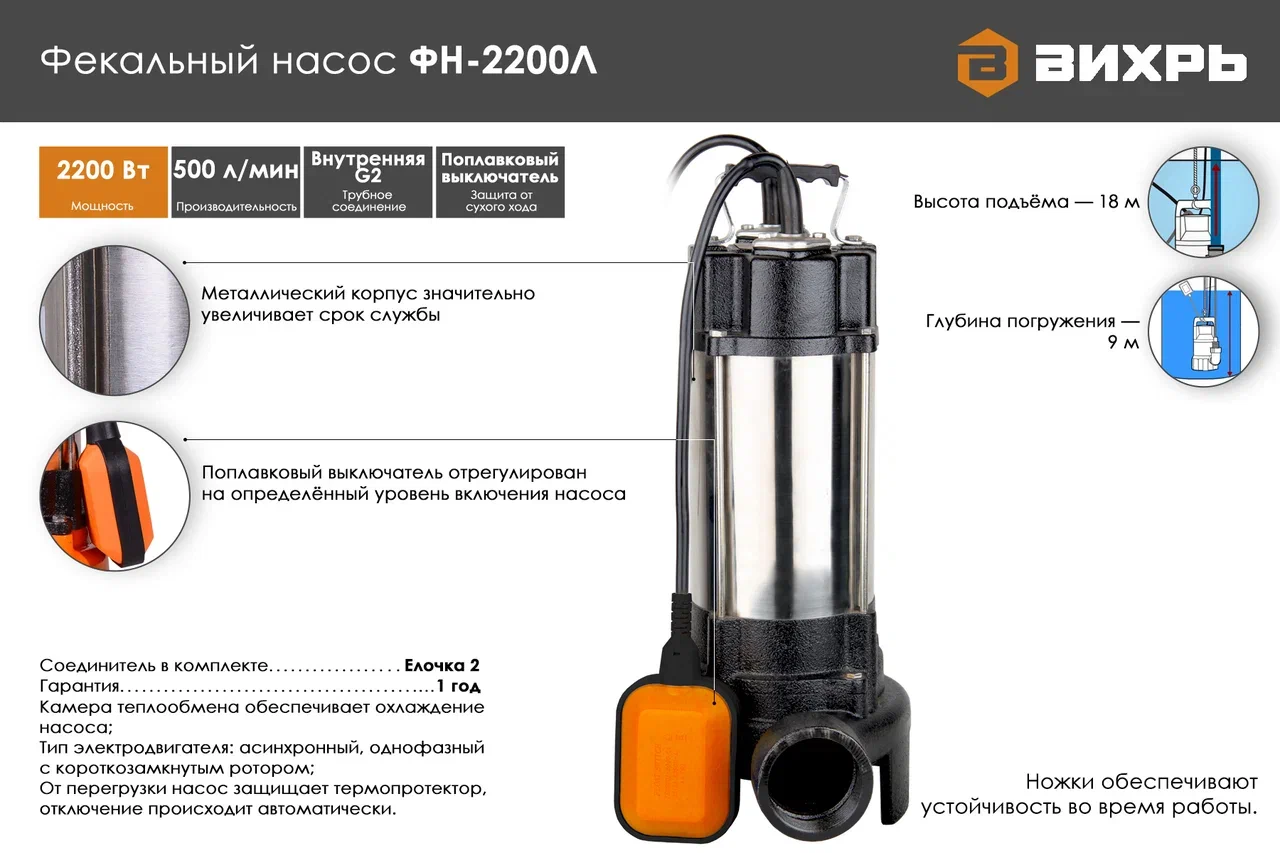 Фекальный насос ВИХРЬ ФН-2200Л является самых мощным и производительным агрегатом в линейке насосов производителя. Погружное устройство предназначено для откачки жидкости, имеющую высокую загрязненность с волокнистыми примесями, для удаления которых в наличии имеется измельчительное лезвие. Может применяться для осушения подтопленного подвала, погреба, гаража, работы на автомойке. Металлический корпус надёжно защищает внутренние составляющие от механических воздействий. Электродвигатель мощностью 2200Вт, асинхронный, однофазный с короткозамкнутым ротором. Максимальное количество включений в час - 20.
