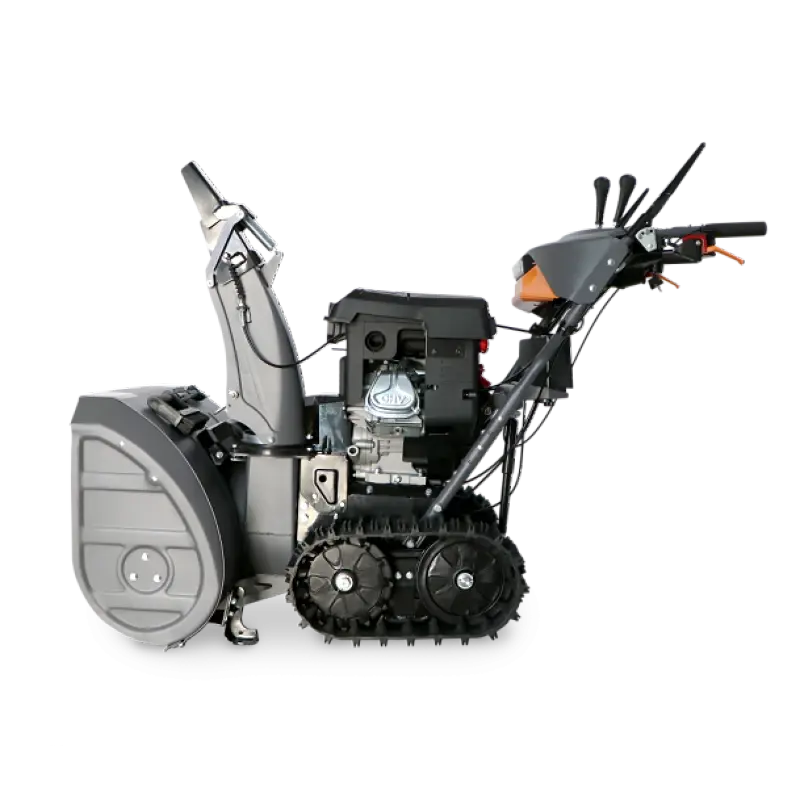 Все рычаги управления удобно расположены под руками. Взаимная блокировка правой и левой рукояток позволяет одной рукой регулировать направление и дальность выброса снежной массы, не останавливая машину. Благодаря переключателю передач можно выбрать подходящую скорость движения вперед и назад. Гусеничный ход обеспечивает хорошее сцепление бензинового снегоуборщика VILLARTEC с дорогой, исключает пробуксовку на обледеневшей поверхности или склонах. В зависимости от качества поверхности высоту снегозаборника над землей можно регулировать путем перестановки опорных лыж ковша. На неровных дорогах, посыпанных гравием, зазор можно увеличить.
