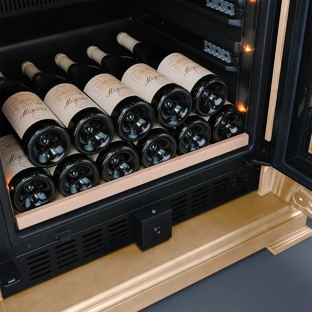 Винный холодильник оснащен дверью с защитой от ультрафиолетовых лучей и отлично подойдет для хранения и созревания различных сортов вин. Динамическая система охлаждения обеспечивает оптимальную температуру для вина и сохраняет необходимую влажность внутри камеры.