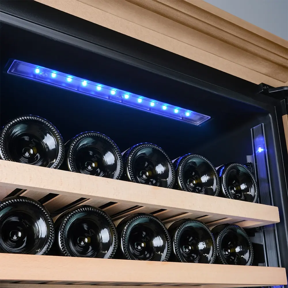 Винный шкаф двухзонный Meyvel MV77PRO-KBT2 (Натуральный бук) имеет привлекательный внешний вид, сочетающий в себе неподвластное времени очарование натурального дерева с высокотехнологичными системами.