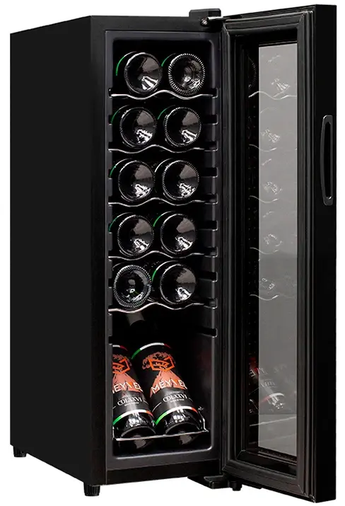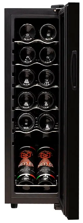 Шкаф имеет в комплекте 5 металлических полок и одну демонстрационную полку, которая позволить сразу же обращать внимание на этикетку нужных вам сортов вина. Общая вместимостью до 12 бутылок типа "Бордо". Полки выполнены из хромированного металла, что обеспечивает их прочность.