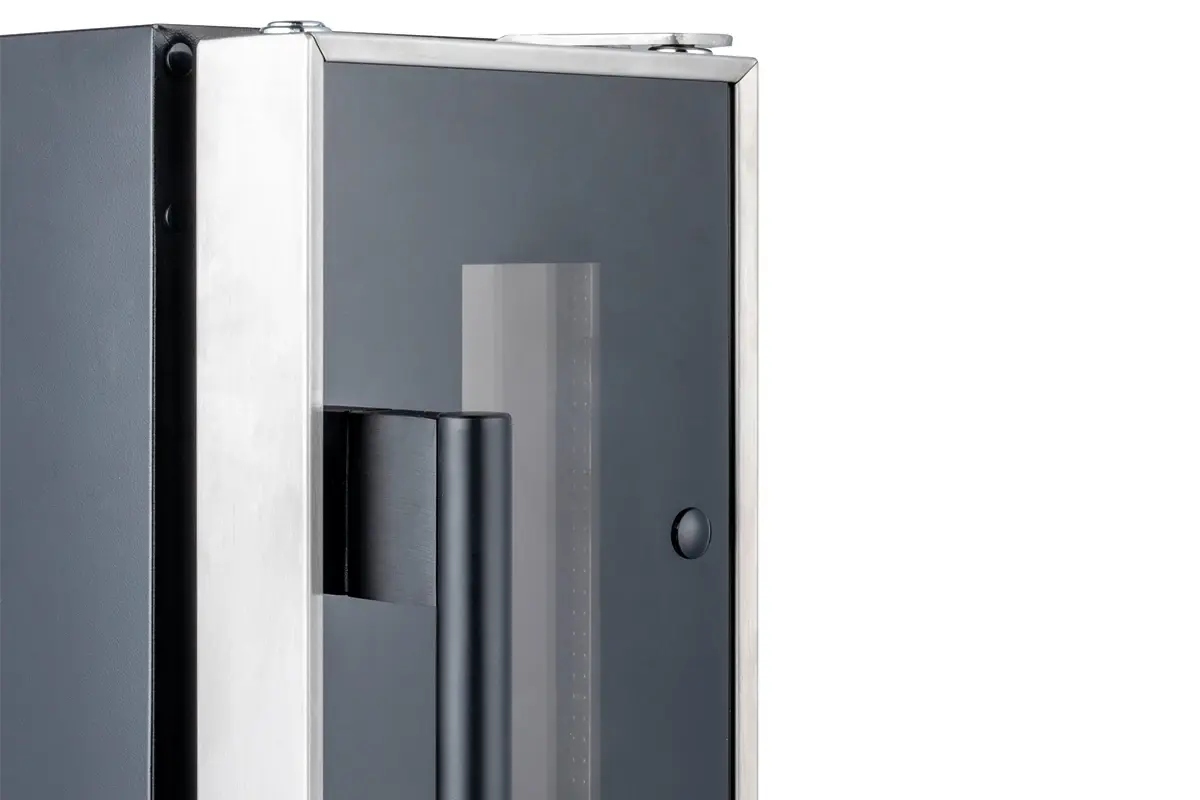 Стильный дизайн с дверцей из стекла чёрного цвета с тонкой стальной рамкой. Полк из нержавеющей стали и светодиодной подсветкой синего цвета. Сенсорная панель панель управления с индикатором температуры.