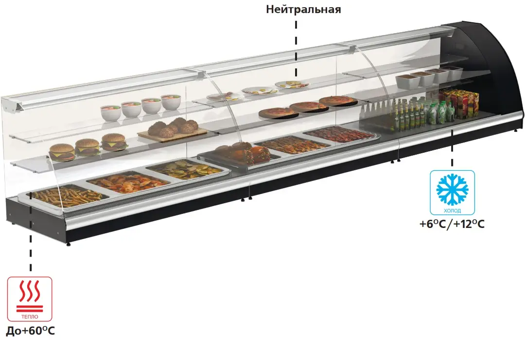 Предназначена для демонстрации, охлаждения и кратковременного кондитерских изделий, десертов и сэндвичей на предприятиях общественного питания и торговли. Модель оснащена гнутым стеклом и 2 охлаждаемыми полками. Нижняя зона выкладки и передняя обшивка выполнены из стали, боковины - из пластика.