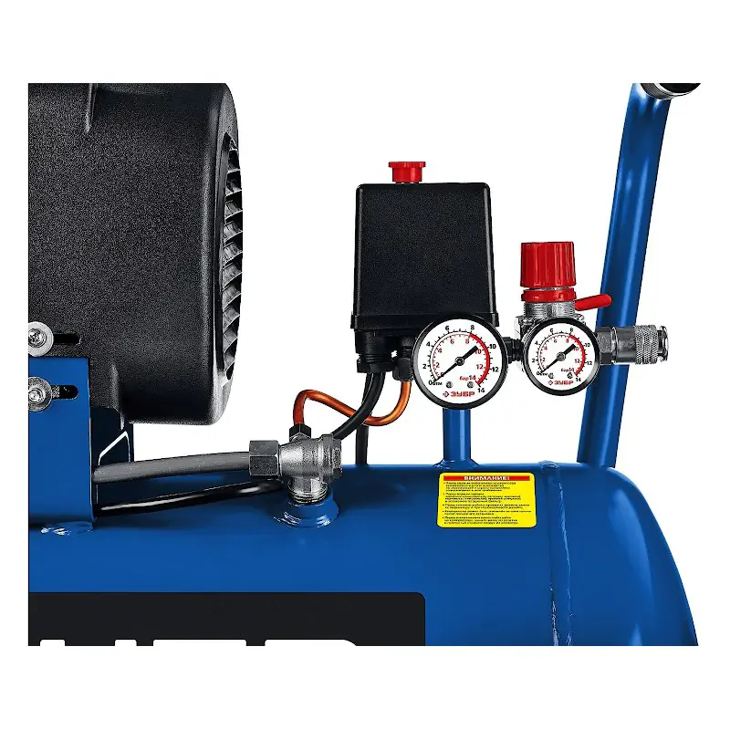 Работа компрессора ЗУБР КПМ-320-50 автоматически регулируется с помощью реле давления, которое отключает двигатель при достижении 8 бар в ресивере. Когда, по мере расходования запасенного в баллоне воздуха, давление снижается до предустановленного минимума, автоматика снова запускает двигатель. Рабочее давление можно регулировать перед подачей сжатого воздуха к инструменту. При выходе из строя реле давления излишки воздуха стравливаются через предохранительный клапан. Манометры позволяют контролировать давление в ресивере и в рукаве быстросъемного штуцера.