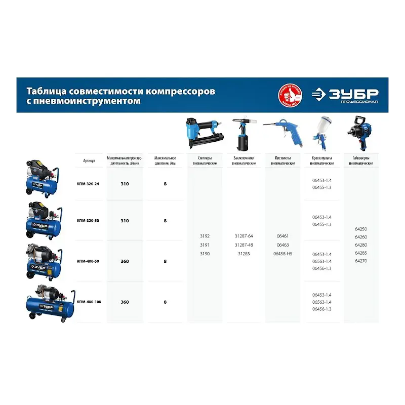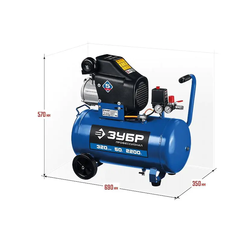 Воздушный компрессор ЗУБР КПМ-320-50 мощностью 2200 Вт используется для снабжения пневматического инструмента сжатым воздухом под давлением до 8 бар. Модель с производительностью 320 л/мин и ресивером на 50 л повышает эффективность работы в мастерской, гараже, на производстве и в строительстве.