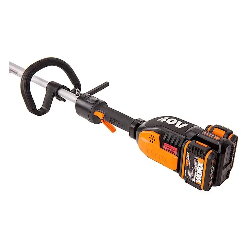 Аккумуляторный триммер WORX WG186E.92 поможет в уходе за приусадебным участком площадью до 10 соток. Оснащение леской и ножом обеспечивает скашивание обычной газонной травы и высокого бурьяна. Устройство работает от двух универсальных аккумуляторов напряжением 20 или 40 В. В полуавтоматическую катушку можно заправлять леску толщиной 2,4 мм. Кожух из прочного пластика защищает от вылетающей травы.