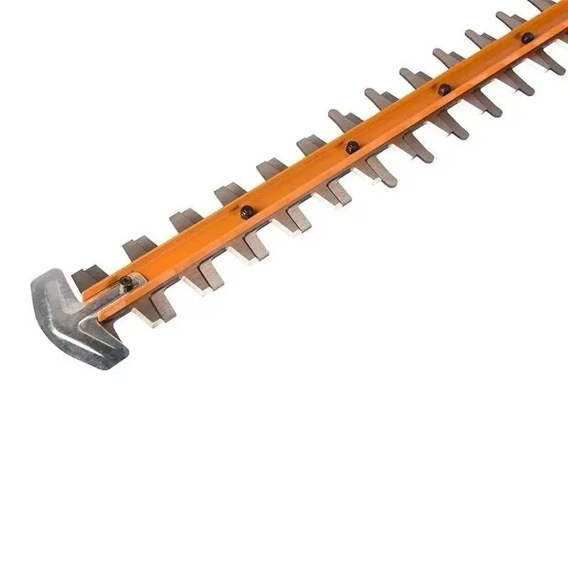 Лезвие аккумуляторного кустореза обладает лазерной заточкой и выполнено с алмазным напылением. За счет этого место среза получается ровным, а значит растение будет быстрее восстанавливаться и не станет подсыхать. Большая длина полотна позволит достать даже до высоких ветвей, не применяя стремянки.