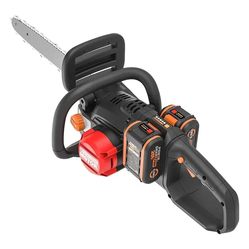 Аккумуляторная цепная пила WORX WG385E.9 пригодится в домашнем хозяйстве для распила древесины во время строительных работ, заготовки дров или ухода за садовыми деревьями. Инструмент работает от двух универсальных 20-вольтовых аккумуляторов системы POWERSHARE. Вы можете использовать уже имеющиеся совместимые батареи WORX любой емкости. 16-дюймовая шина позволяет распиливать бревна диаметром до 40 см. Модель имеет все необходимые защитные приспособления: зубчатый упор, тормоз и уловитель цепи.