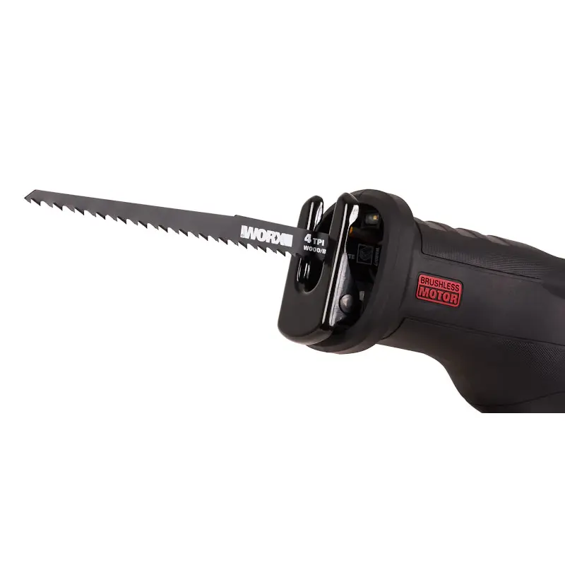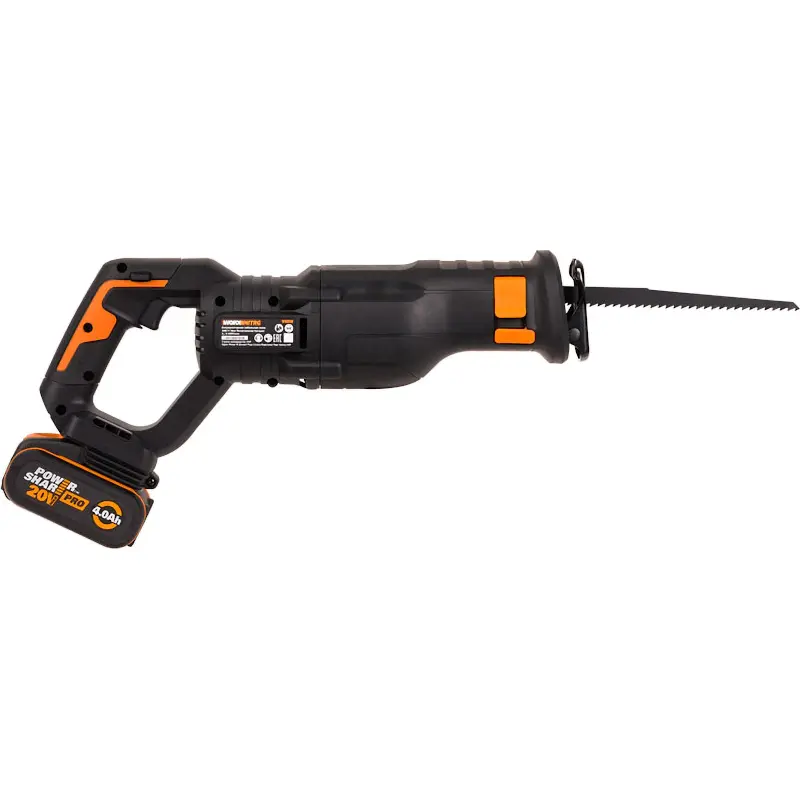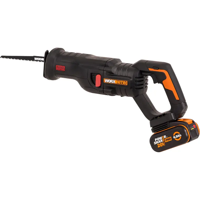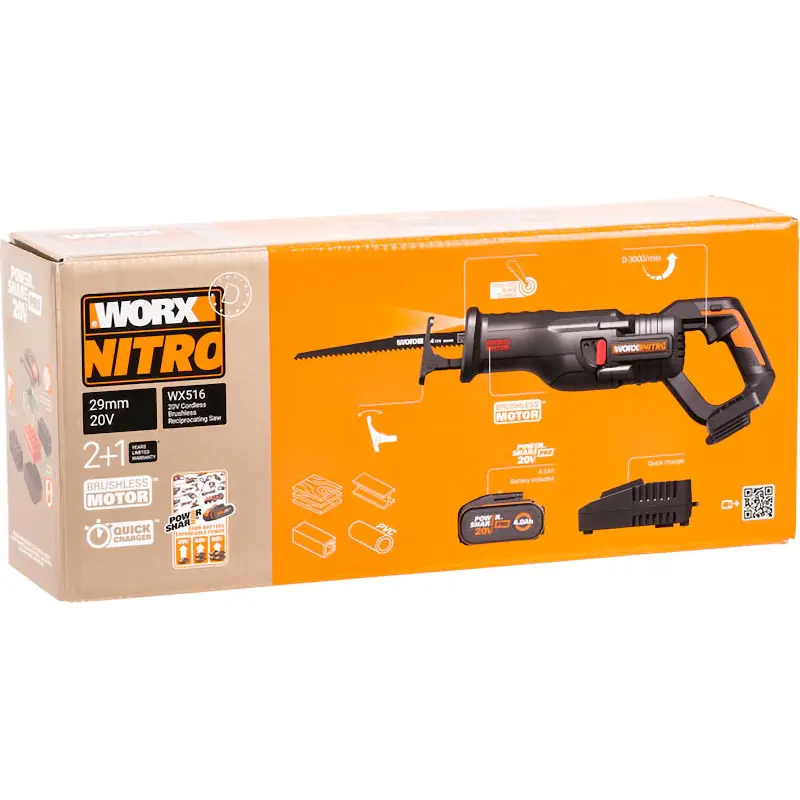 В сабельной пиле WORX WX516 установлен бесщеточный мотор. В отличие от щеточного аналога, его срок службы в 10 раз больше, мощность выше на 25 %, а длительность работы дольше на 50 %. Питание происходит от аккумулятора из комплекта. Он подходит практически ко всем инструментам фирмы WORX. Батарея снабжена системой защиты, которая бережет ее от перегрева и глубокой разрядки.
