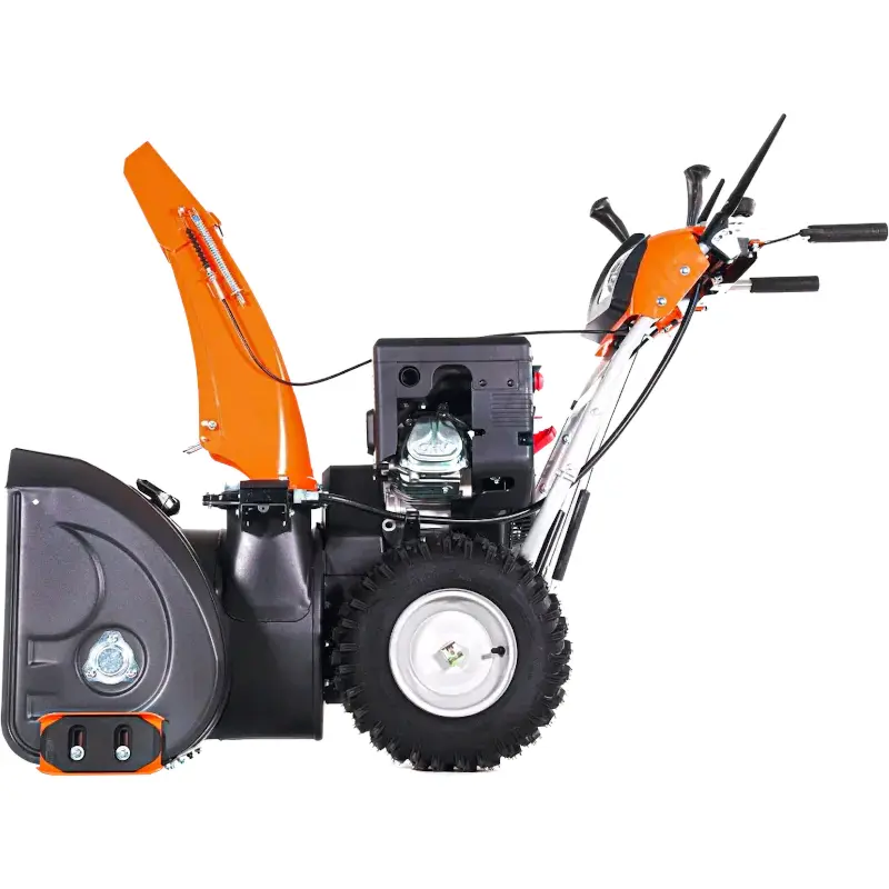 Эффективную и качественную уборку снега обеспечивает двухступенчатая система шнеков. Зубчатый шнек загребает и перемалывает снежную массу в крошку, которая затем выбрасывается с помощью крыльчатки через желоб. Расстояние выброса достигает 11 метров, а направление регулируется на угол до 180°.
