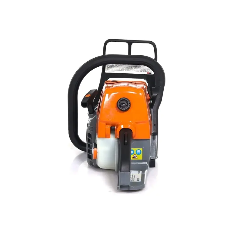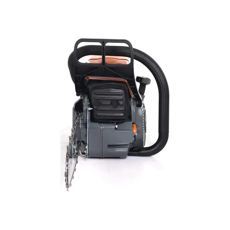 Бензиновая пила оснащена цепным тормозом. Он срабатывает как вручную, так и автоматически при возникновении отдачи. Тормоз мгновенно останавливает движение пильной цепи, повышая безопасность работы.