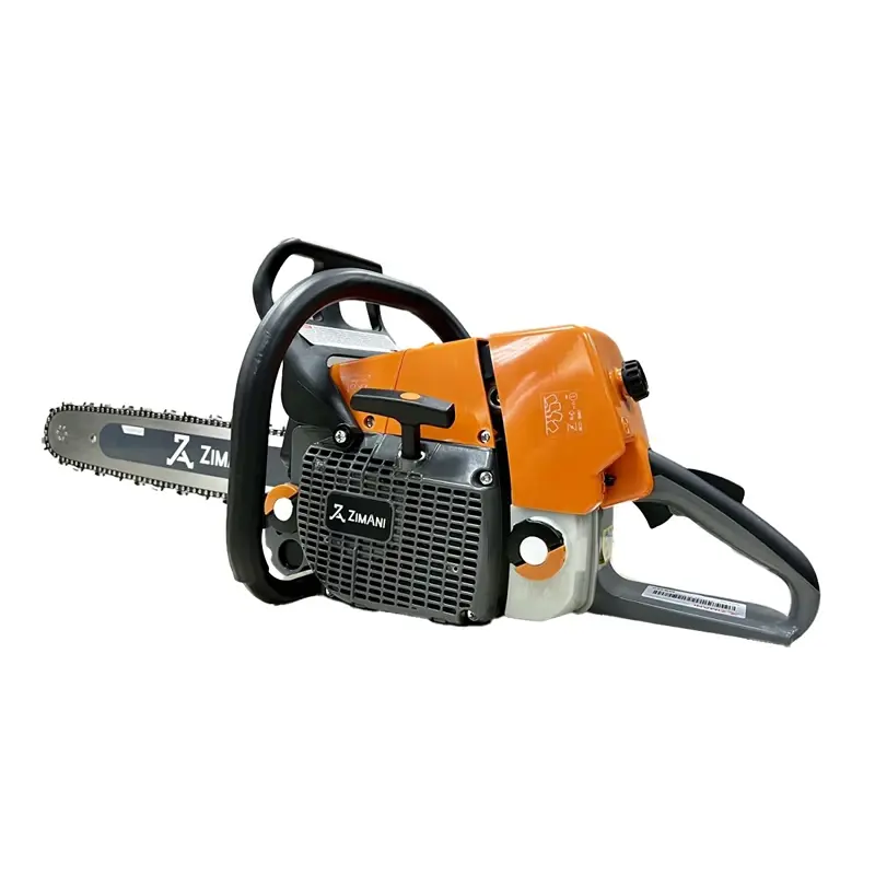 - Ручной тормоз ZimAni SpeedStop. Моментальная остановки цепи, является защитным механизмом для обеспечения высокой безопасности, необходимой при работе с бензопилами. Срабатывает, как механически при нажатии рукой на защитный упор, так и автоматически, при сильной отдаче или падении пилы, практически мгновенно останавливая пильную цепь. Защитная рукоятка тормоза крепится на двух опорах, что обеспечивает надежность и удобство.