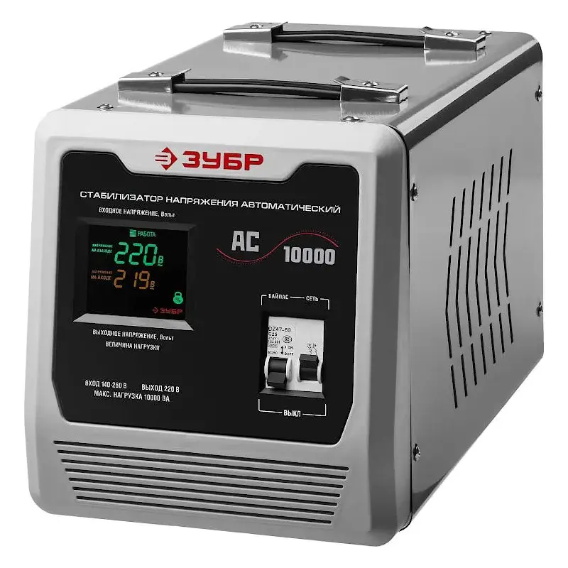 Автоматический стабилизатор напряжения Зубр АСН-10000-1-Ц мощностью 10 кВА защищает подключенную технику от перепадов электричества. Для простого использования на панели управления есть цифровой дисплей и светодиодная индикация.