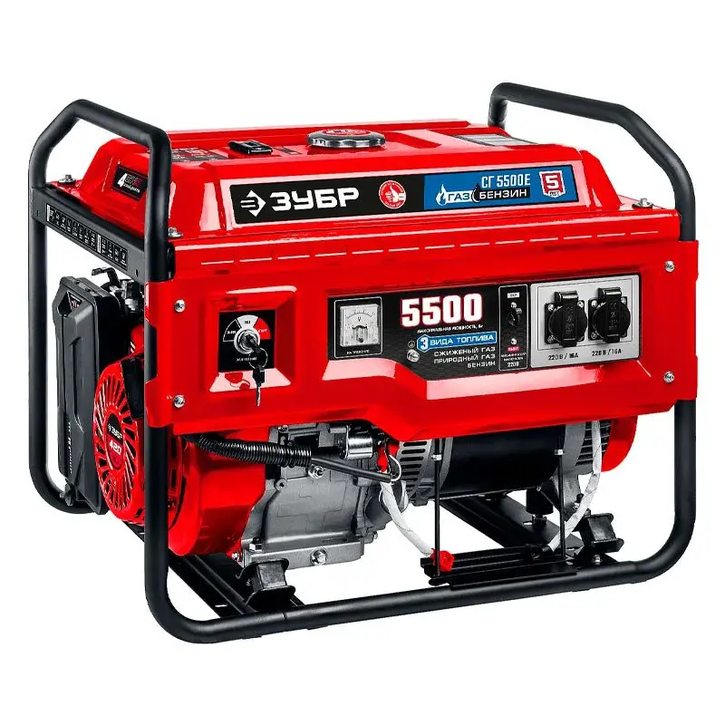 - Мощный двухтопливный электрогенератор мощностью 5.5 кВт, работающих как на бензине (АИ-92), так и на газе – при этом, для использования газа не требуется установка дополнительного оборудования. Генератор этой модели используется в загородном доме, строительной площадке и дачном участке для питания бытовой техники, насосных станций и электронагревателей.