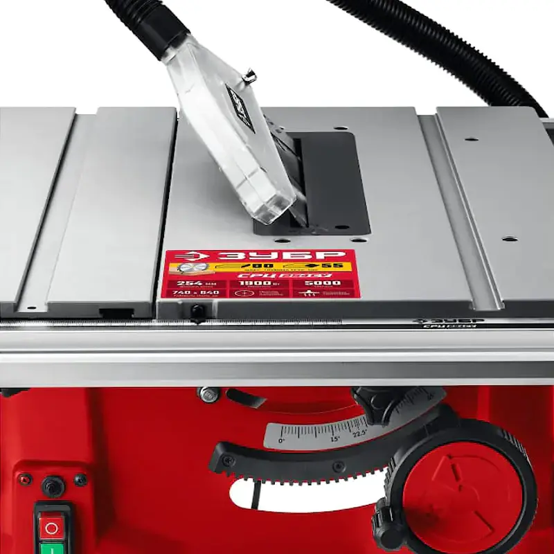В станке предусмотрен пылеотвод, через который удаляются опилки и древесная пыль. Патрубок расположен в верхней части защитного кожуха диска. Это позволяет эффективно убирать продукты пиления из рабочей зоны, улучшает обзор линии реза.